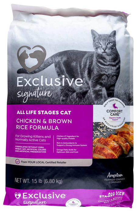 Exclusive Signature Chicken & Brown Rice Formula Cat Food is formulated to meet the nutritional levels established by the AAFCO Cat Food Nutrient Profiles for all life stages of cats.