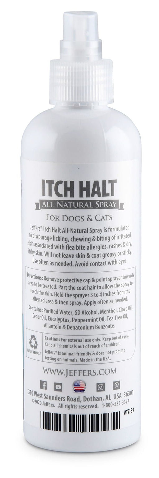 Jeffers Itch Halt Spray for Dogs and Cats Jeffers Itch Halt Spray is designed to help discourage licking, chewing, and biting of irritated skin cau...