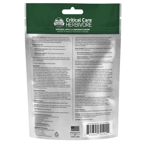 View full detailsOxbow Critical Care Herbivore Diet, Apple Banana Oxbow Critical Care Herbivore Diet is a premium recovery food designed for herbivores who are unab...