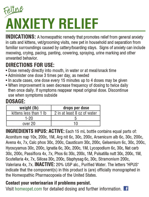 HomeoPet Anxiety Relief Feline, 15 mL Cat Anxiety relief Specific for cats to reduce anxiety or stress. Great for jealousy, spraying, meowing, hidi...