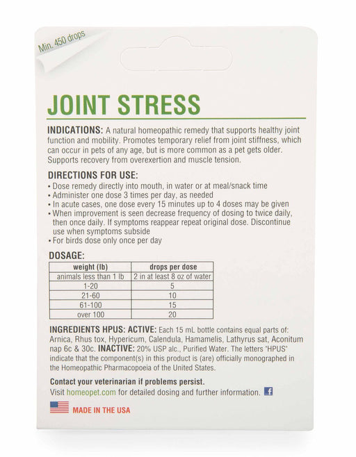 HomeoPet Joint Stress, 15 mL Provides maximum support for restoring healthy joint function for dogs and cats. Stimulates: Cartilage regeneration F...