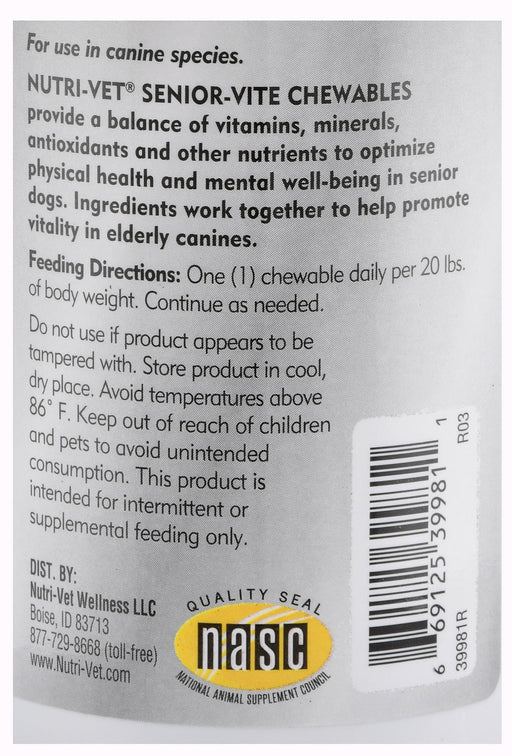 View full detailsNutri-Vet Senior-Vite Chewables Nutri-Vet Senior-Vite Chewables is a senior vita-lit multivitamin complex that provides a balance of vitamins, mine...