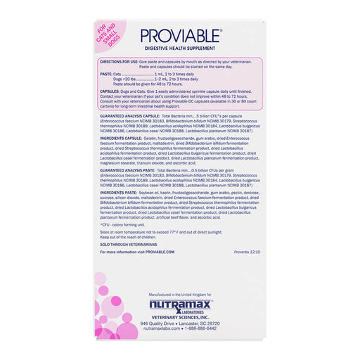 Nutramax Proviable-DC for Dogs & Cats Proviable DC is a clinically researched multi-strain probiotic supplement designed for cats and small dog...