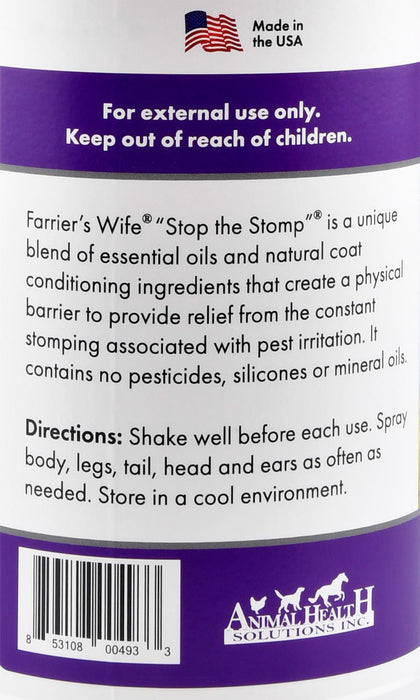 Farrier's Wife Stop the Stomp is a unique blend of essential oils and natural coat conditioning ingredients that create a physical barrier to provide relief from the constant stomping associated with pest irritation.