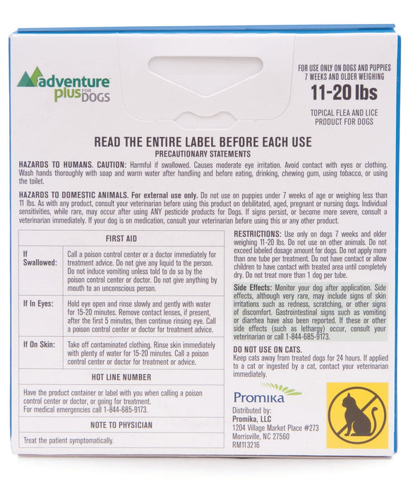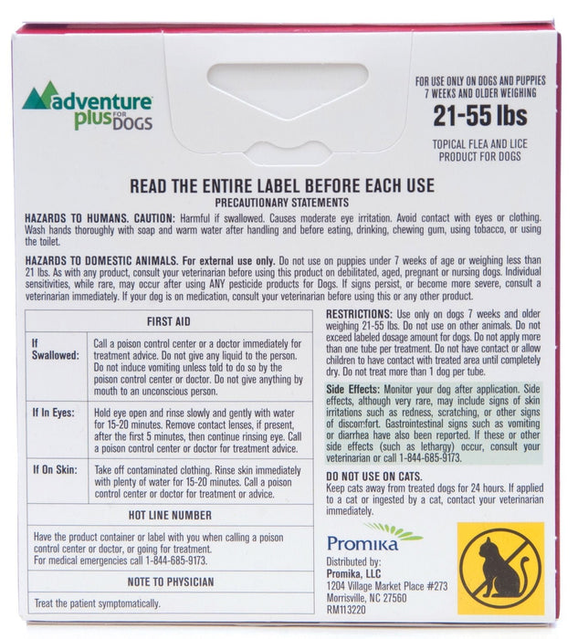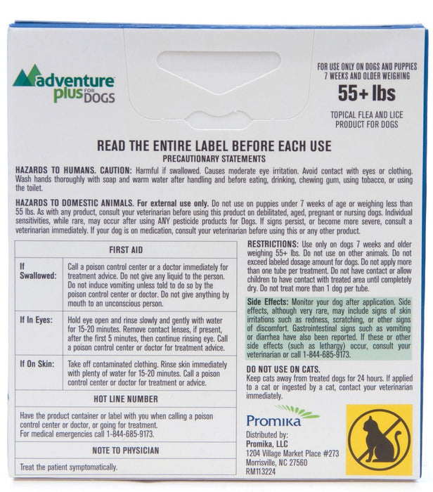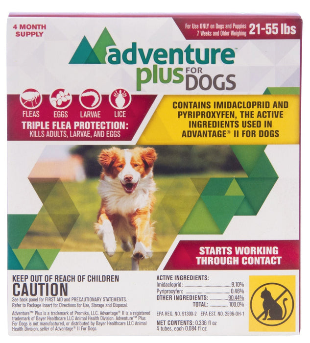 Adventure Plus Topical Flea Treatment provides fast and effective protection against fleas and lice. Formulated with imidacloprid and pyriproxyfen, the same active ingredients found in Advantage II® for Dogs, this treatment kills all life stages of fleas within 12 hours and helps prevent re-infestation. With a waterproof formula, it remains effective even after exposure to water. Designed for dogs and puppies over 7 weeks of age, each package includes a 4-month supply for one dog.