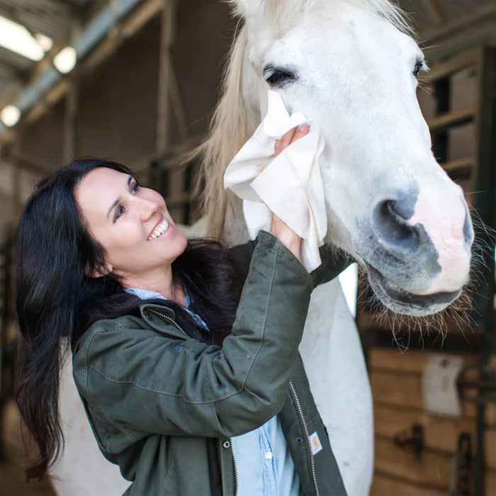 Betty's Best Skin & Coat Cloth Wipes offer unmatched convenience and versatility. Designed for horses, dogs, and more, these natural bamboo cloths are your go-to solution for comprehensive cleaning. From face to hooves, they're saturated and absorbent, effortlessly tackling even the toughest messes. What sets them apart is their commitment to safety and sustainability. Made with hypoallergenic ingredients, these wipes are not only gentle on your pet's skin but also environmentally friendly, being biodegradable and washable for multiple uses. Plus, their big sizes ensures they're up to any cleaning task, measuring a generous 8" x 8" or 12" x 12" with double thickness for superior absorbency and durability. Betty's Best Skin & Coat Cloth Wipes: the smart choice for pet and horse care, combining convenience, safety, and sustainability.