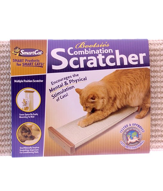 The Bootsie's All-In-One Cat Scratcher is made with durable woven sisal in a 24" x 7" x 2½" design with wooden base. Comes with easy wall mounting system, or you can lay it on the floor to use as a free laying scratching block. The rubber feet provides stability so it can sit at an angle and also help prevent slipping while on the floor.