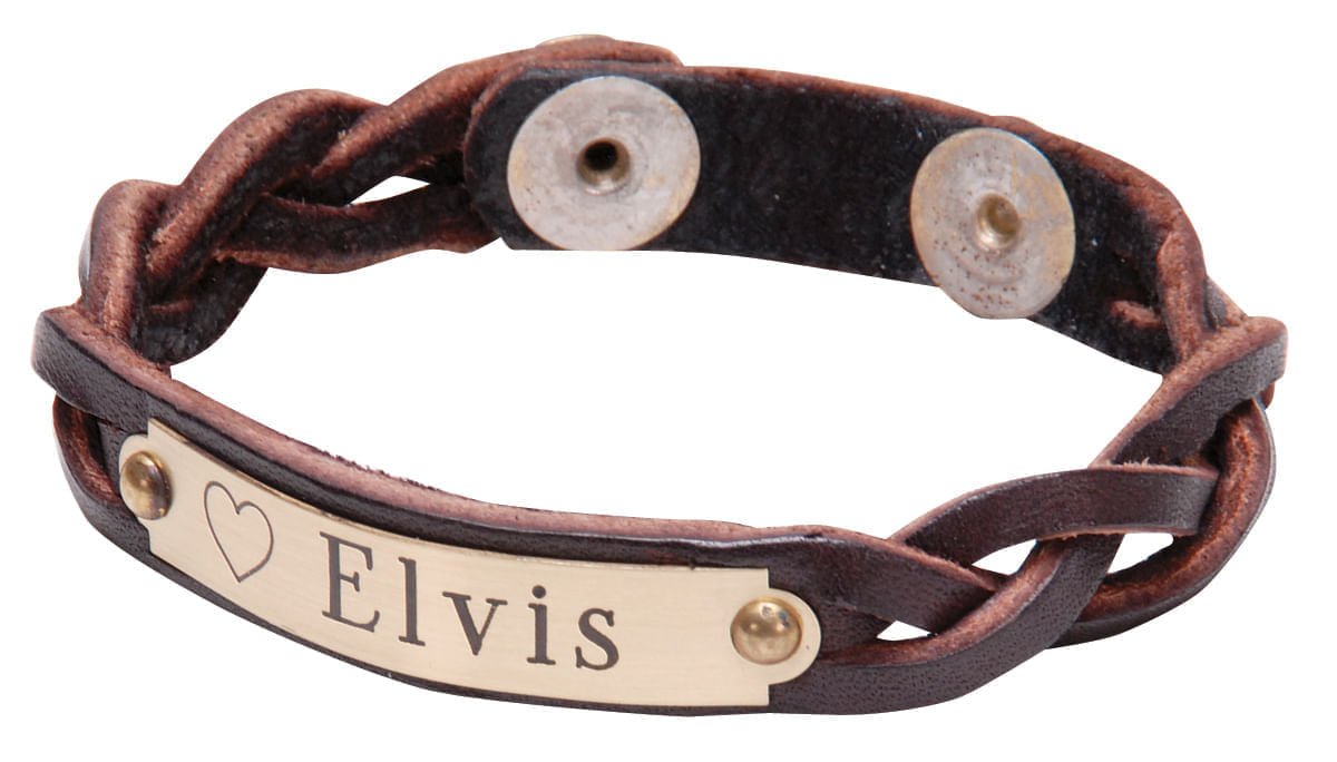 Two-snap closure adjusts from 7" to 8" wrists. Includes an engraved plate that holds a maximum of 15 letters.