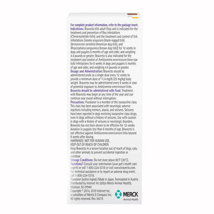 Bravecto (fluralaner) Chews for Dogs is the longest-lasting chewable treatment on the market, providing nearly 3 times the duration of monthly options. Fast-acting and easy to administer, this pork-flavored chew starts killing fleas within 2 hours and ticks within 12 hours of dosing.
