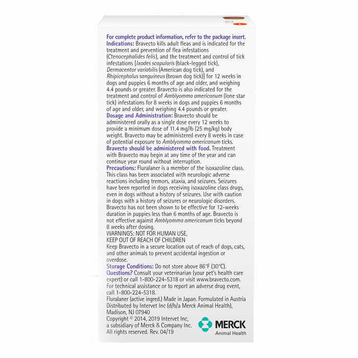 Note: Bravecto is a prescription medication. Consult your veterinarian before use. Proudly sourced directly from the manufacturer or approved distributor—guaranteed genuine and backed by the manufacturer.