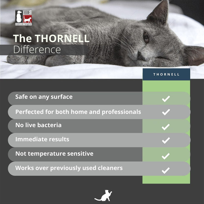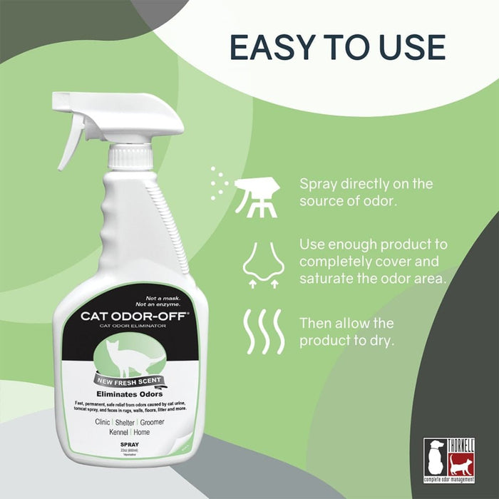 Thornell's Cat Odor-Off Fresh Scent Spray eliminates cat odors such as urine, tomcat spray, and feces on multiple surfaces while leaving a fresh scent. It may be applied directly on cages, fabric, carpet, floors, walls, or any place an odor problem exists.