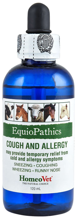 EquioPathics Cough & Allergy Relief provides natural relief from coughing, sneezing, wheezing, runny nose and shortness of breath caused by allergies, dust, pollen, heaves, and respiratory conditions. It’s safe for young, pregnant, and nursing animals, and contains no harsh chemicals. Easily administered in food, water, or directly into the mouth, this supplement supports respiratory health for horses, cattle, and other animals.