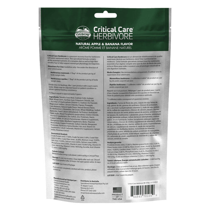Oxbow Critical Care Herbivore Diet is a premium recovery food designed for herbivores who are unable to eat their regular diet due to illness, surgery, or poor nutritional status. This highly nutritious formula provides essential nutrients, including high-fiber timothy hay, to support proper gut function and digestion. The apple-banana flavor enhances palatability, making it easier for pets to consume. Developed for effectiveness and versatility, this diet is recommended for maintaining your pet’s health during recovery.