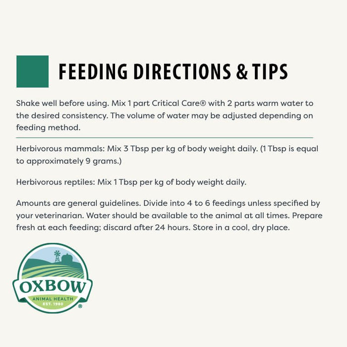 Directions: Shake well before use. Mix 1 part Critical Care with 2 parts warm water to achieve desired consistency. For herbivorous mammals, use 3 Tbsp per kg of body weight daily. For herbivorous reptiles, use 1 Tbsp per kg of body weight daily. Divide into 4 to 6 feedings as advised by your veterinarian. Always provide fresh water and prepare fresh at each feeding; discard after 24 hours. Store in a cool, dry place.