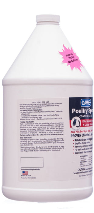 Davis Poultry Spray Concentrate is a safe, all-natural solution for controlling pests in poultry facilities and directly on birds. This non-toxic formula is free of pyrethrins and permethrins, making it ideal for sensitive environments. Safe to use even while birds are present, this gallon of concentrate yields up to 40 gallons of ready-to-use spray for effective pest control.