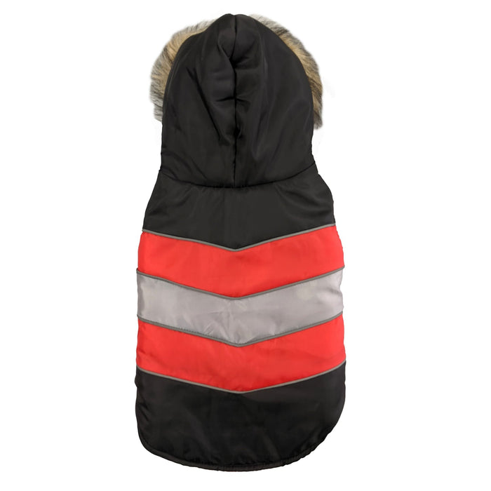 The faux fur-trimmed hood adds a touch of luxury and warmth, ensuring your pet stays comfortable in style. What sets this coat apart is its reversible design, offering two distinctive looks in one. Flip it, and you'll reveal a solid red fleece side, perfect for a classic and cozy appearance.