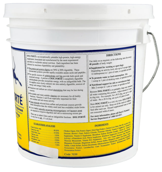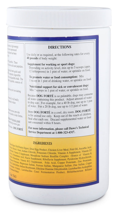 DOG FORTE is an extremely palatable, high-protein, high-energy supplement for dogs. Originally designed for working and sporting dogs to provide a nutrient boost and to stimulate hydration, it's also perfect for active companion dogs and sick or convalescent animals. DOG FORTE is an excellent supplement for breeding dogs as well. A convenient powder formula that easily mixes with water to make a yummy gravy, or it can be sprinkled directly onto wet or dry food, with no mixing needed! Contains no fillers and is all food! It's 94-98% digestible!