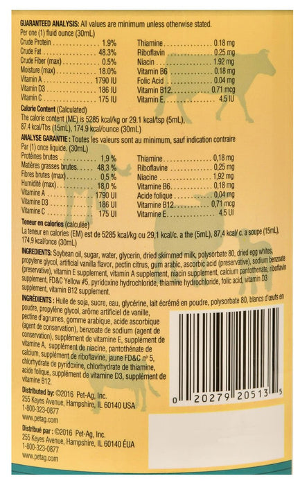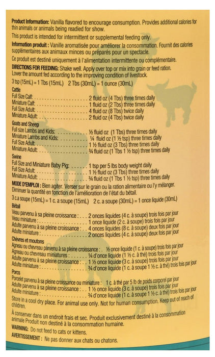 Dyne High Calorie Liquid is a high-fat, high-calorie supplement enriched with essential vitamins to support weight gain, energy, and recovery in livestock. It delivers concentrated nutrition in a small volume. This supplement helps active, recovering, or senior animals - including equine - maintain or regain healthy weight and condition. Ideal for animals recovering from illness, preparing for show, or needing additional calories. Suitable for cattle, goats, sheep, pigs, and horses over one week of age. Not for use in cats.