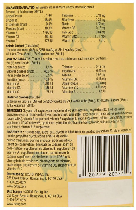 Soybean oil, sugar, water, glycerin, dried skimmed milk, polysorbate 80, soy protein isolate, propylene glycol, artificial vanilla flavor, pectin citrus, gum arabic, ascorbic acid (preservative), sodium benzoate (preservative), vitamin E supplement, vitamin A supplement, niacin supplement, calcium pantothenate, riboflavin supplement, FD&C Yellow #5, pyridoxine hydrochloride, thiamine hydrochloride, folic acid, vitamin D3 supplement, vitamin B12 supplement.