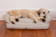 A waterproof, breathable liner protects the foam core from accidents and moisture, while the soft, quilted cover—crafted from a blend of cotton, polyester, viscose, and linen—offers cozy, durable comfort. The overstuffed headrest provides a secure, nesting feel that dogs love.