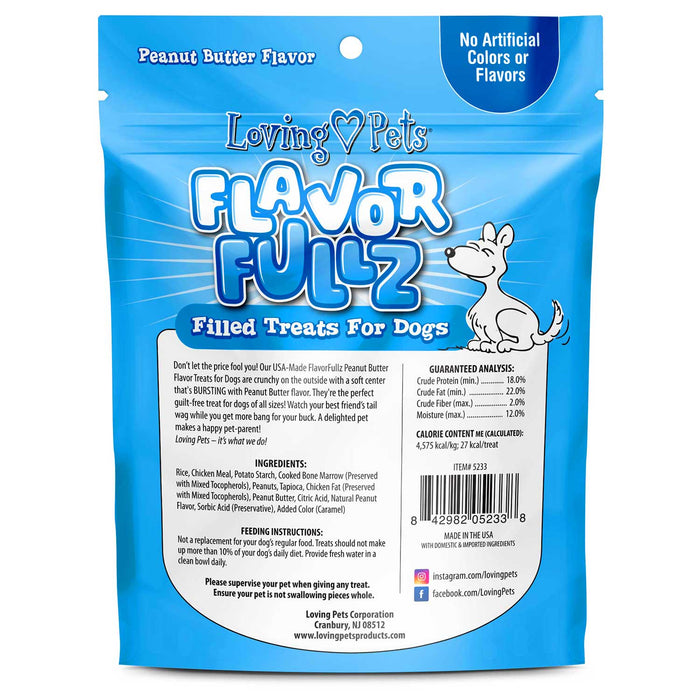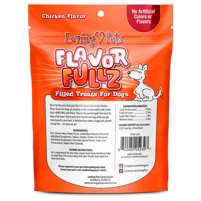 Loving Pets USA-Made FlavorFullz Dog Treats offer a delightful combination of textures and flavors that your dog will love. Each treat is crunchy on the outside and features a soft, flavorful center that's bursting with taste. Available in Chicken, Bacon, or Cheese flavors, these treats provide a delicious and satisfying snack for your furry friend. Treat your dog to the irresistible taste of FlavorFullz and watch their tail wag with joy!