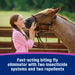 Repellent fly spray contains 0.20% Pyrethrins & 0.20% Permethrin to control face, stable & house flies, mosquitoes & gnats on horses, foals, dogs & puppies over 6 weeks old. Also contains sunscreen, aloe & lanolin. Apply spray daily for 2-3 days. Repeat every 5-10 days as needed.