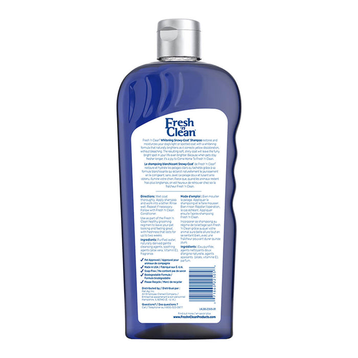 Fresh 'n Clean Snowy Coat Whitening Shampoo Fresh 'n Clean Whitening Snowy-Coat Shampoo restores and moisturizes your dog's light or spotted coat with a whitening formula that naturally brightens as it corrects yellow discoloration without bleaching. The resulting soft, shiny coat will leave the furry bright spot in your life even brighter.