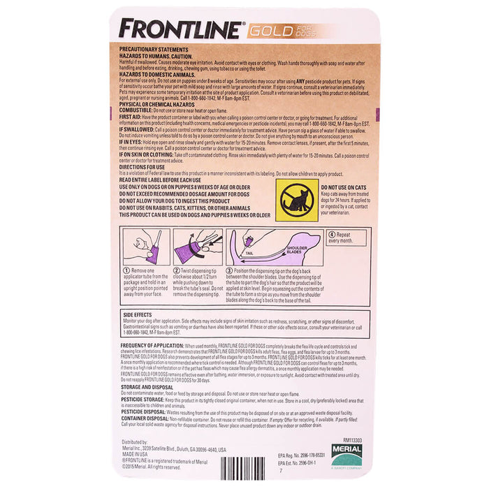 Frontline Gold is a once-a-month topical treatment with a new triple action formula that combines two *IGR's to destroy flea eggs and larvae. Protect your dog against fleas and ticks with Frontline Gold's Power of 3! In addition to fipronil and (s)-methoprene, the powerful new ingredient, pyriproxyfen, helps to kill the next generation of flea eggs and larvae before they can develop into adult fleas.