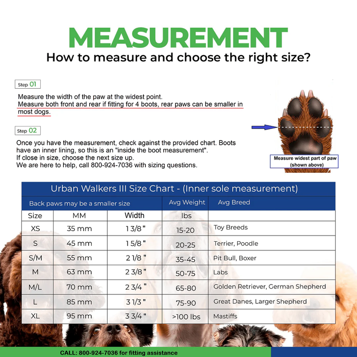 Urban Walkers III are offered in seven sizes to fit most breeds. Since a dog’s back paws may require a smaller size than the front paws, our boots are sold in pairs to allow pet owners to choose the right size for the best fit.