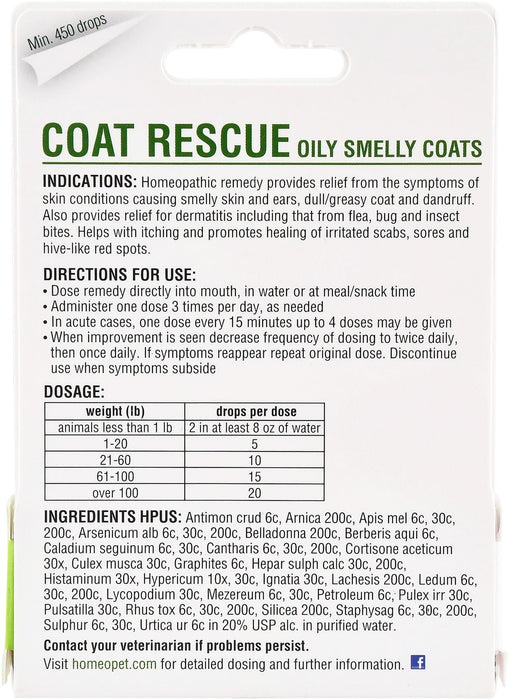 HomeoPet Coat Rescue is specifically for oily, smelly coats. It also provides relief for dermatitis including that from flea, bug, and insect bites.
