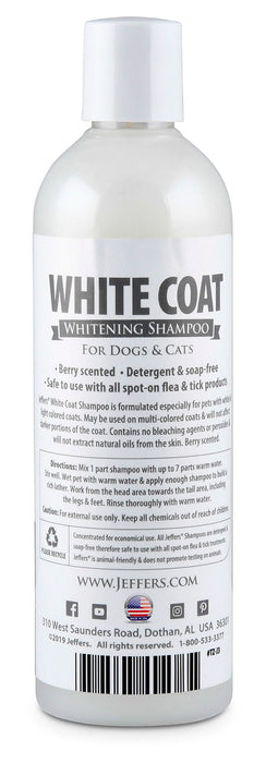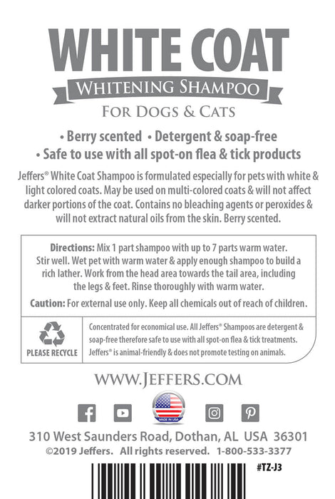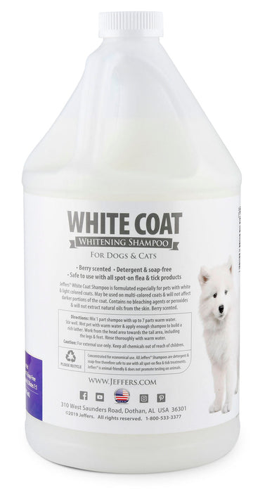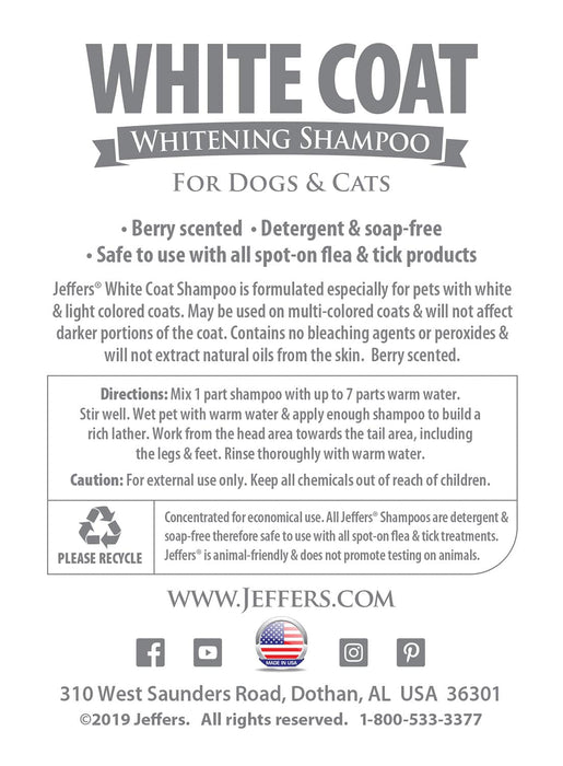 Jeffers White Coat Pet Shampoo is specially designed for white and light-coated pets, enhancing their natural brightness without the use of bleaching agents. Its gentle, soap-free formula cleans effectively while maintaining coat health. Safe for use on partly colored coats without causing discoloration. Berry scented for a fresh, pleasant fragrance.