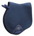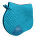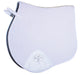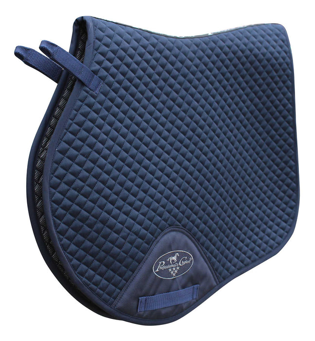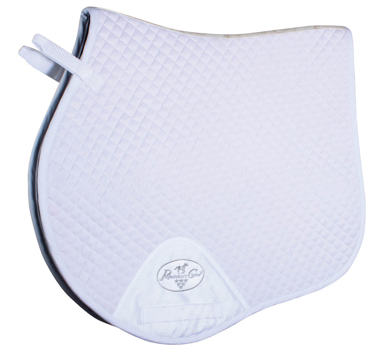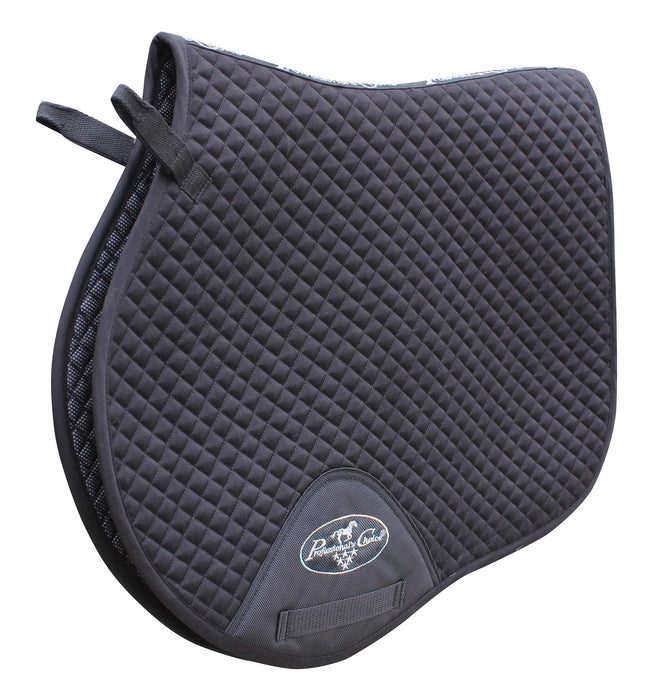 In addition, the quilted cotton top layer is stain resistant. Reinforced ballistic billet guards provide extra durability. The pad is designed with a contoured back for wither clearance and correct fit, which helps keep the pad securely in place. Webbed D-ring straps feature hook and loop for easy application. Designed to fit most jump saddles, including those with more forward flaps. Dimensions: 21.5” x 20.5”.