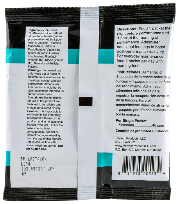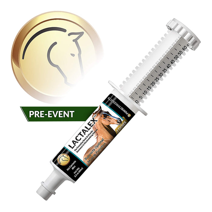 Vitamin E acts as a free radical scavenger to support the repair of damaged muscle cells. Branch Chain Amino Acids support the return of muscles to pre-exercise condition. Administration of Lactalex can relieve back soreness and help your horse break at the neck better.
