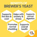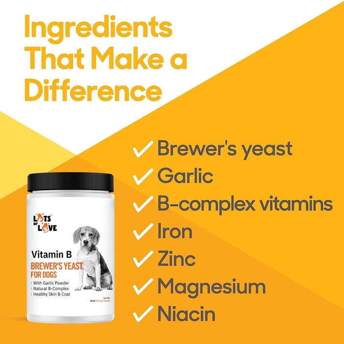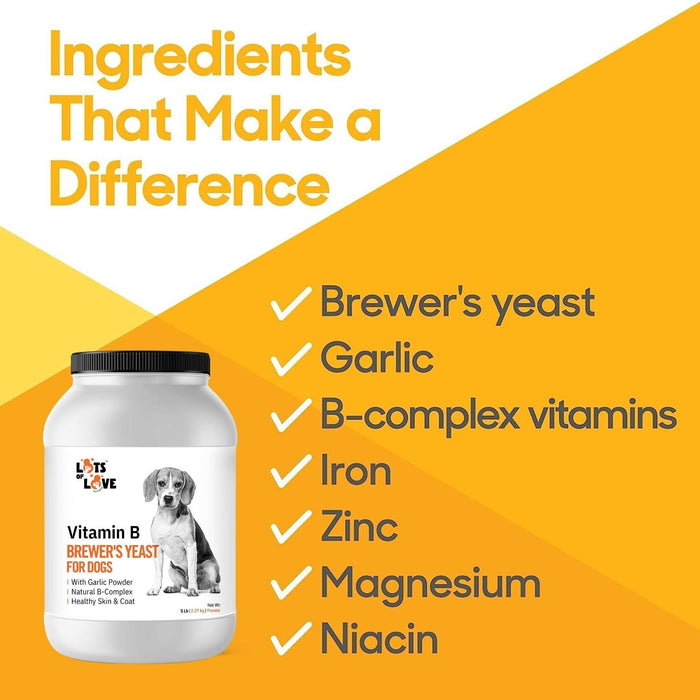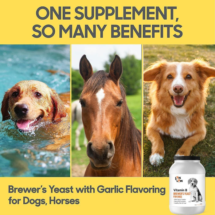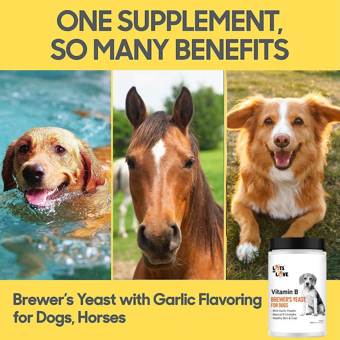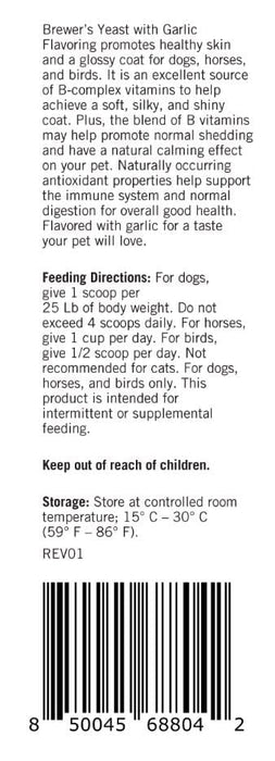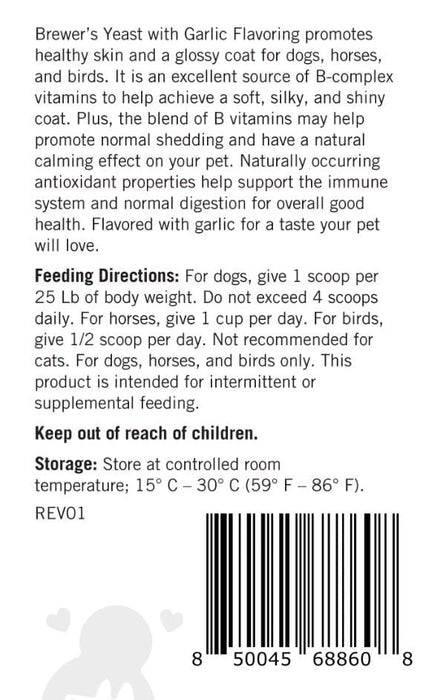 Brewer’s Yeast with Garlic Flavoring from Lots of Love Pet Products contains vitamins and minerals essential for promoting healthy skin and a glossy coat in dogs, horses, and birds. It is an excellent source of B-complex vitamins to help achieve a soft, silky, and shiny coat. Plus, the blend of B vitamins may help promote normal shedding and have a natural calming effect on your pet.