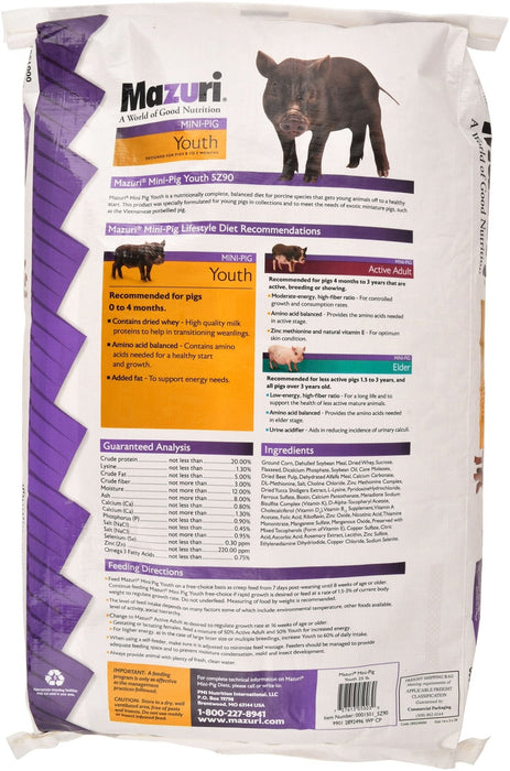 The Mazuri Mini Pig Youth Diet is a nutritionally balanced mini pig food formulated to help young animals off to a healthy start. This mini pig diet, which contains high-quality milk proteins help transition weaning minipigs. No supplementation is needed with Mazuri mini pig food.