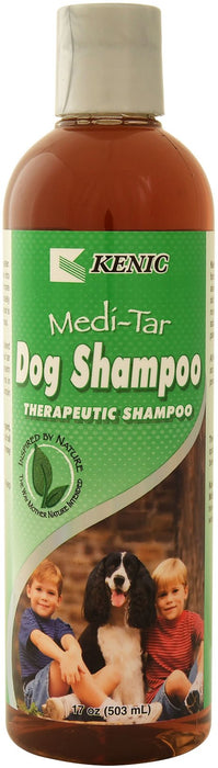 KENIC Medi-Tar Therapeutic Shampoo for Dogs contains 2% solubilized coal tar (USP) and natural aloe vera to relieve itching, scratching and odor caused by flea bites, seborrhea and non-specific dermatologist. Pleasant fragrance, will not stain white or light dog coats.