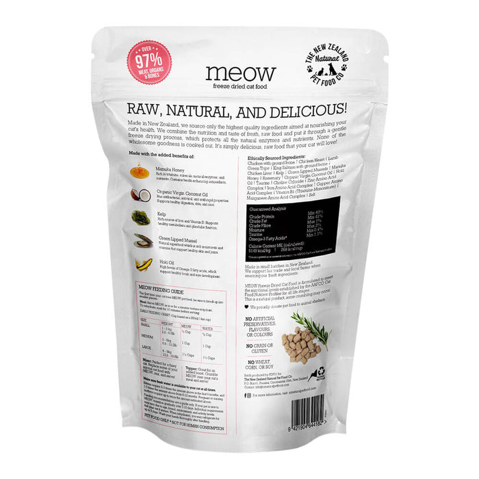 MEOW Chicken & King Salmon Freeze Dried Cat Food is made using only the highest quality ingredients aimed at nourishing your pet's health. MEOW combines the nutrition and taste of fresh, raw food by gently freeze-drying to protect all the natural enzymes and nutrients, ensuring none of the wholesome goodness is cooked out. Raw, natural, and delicious!
