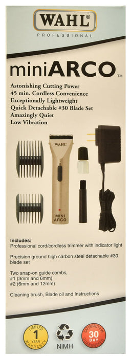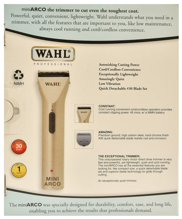 Wahl Mini Arco Trimmer (WCE1) cord or cordless comes equipped with a #30 fine cut blade and provides 45 minutes of cordless operation. This trimmer features a slim, ergonomic and lightweight design weighing only 4 oz.