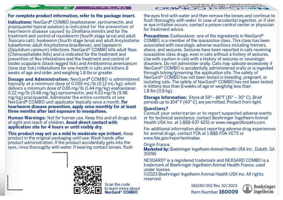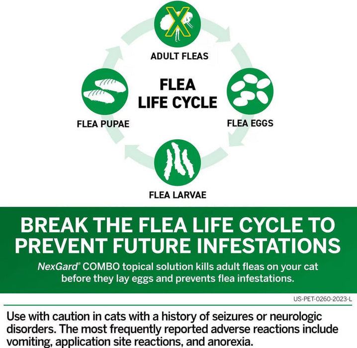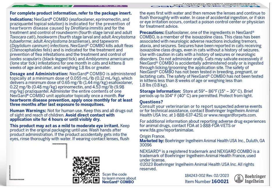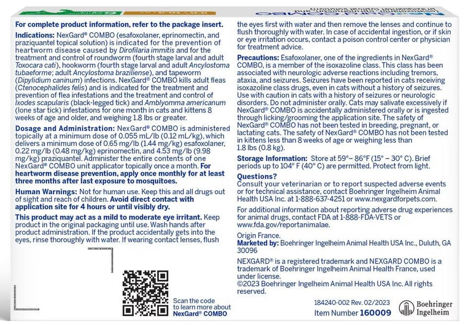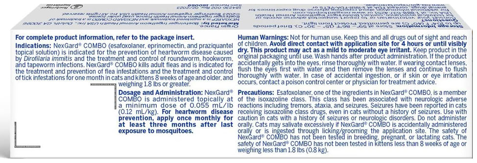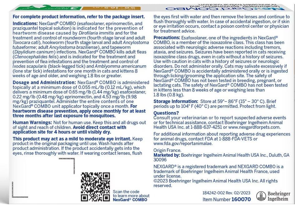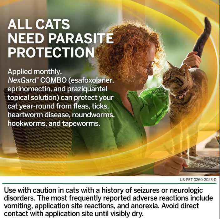 NexGard COMBO Topical for Cats is a comprehensive solution featuring esafoxolaner, eprinomectin, and praziquantel. This advanced topical solution not only effectively eliminates fleas and ticks but also provides broad-spectrum protection. It prevents heartworm disease and efficiently treats and controls hookworms, roundworms, and tapeworms. From the trusted manufacturer of vet-recommended NexGard and HEARTGARD Plus, NexGard COMBO is a reliable choice for holistic parasite protection, ensuring the health and well-being of your feline companion.