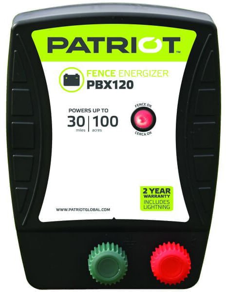 The Patriot PBX120 Battery Energizer is a low impedance, 12 volt (deep cycle, marine type) DC-powered fence charger. Suited for farms with small numbers of livestock and can power up to 30 miles or 100 acres. Deep cycle marine type 12 V battery recommended. Indicator light shows when energizer is pulsing. Low impedance fence charger designed to deliver power to the end of the fence even under heavy loads such as foliage and undergrowth.