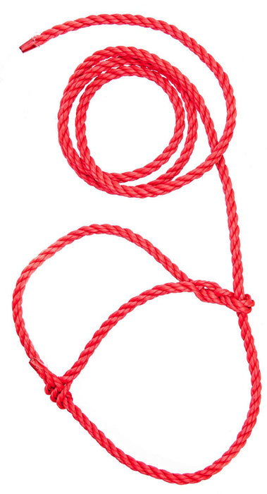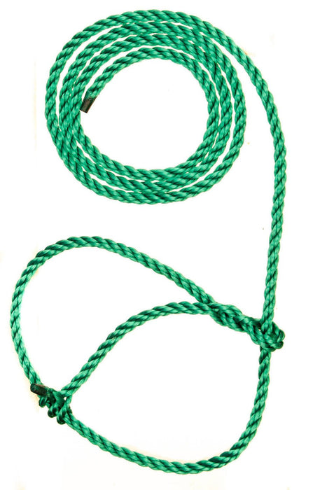Made of 3/8" polypropylene rope with a 5' lead. Adjustable ends melted and secured by galvanized wire.