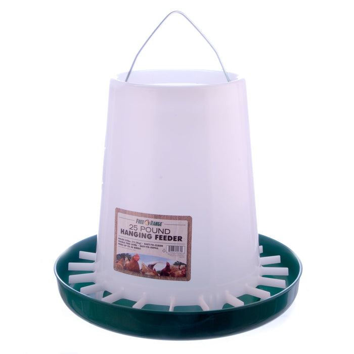 The Poly Hanging Chicken Feeder is made of durable plastic and features a specially designed base that prevents chickens from scratching out feed. Its open top allows for quick and easy filling of feed, making it convenient for both you and your chickens.