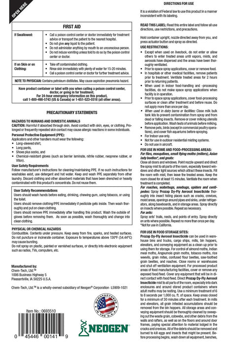 Prozap DyFly Aerosol Insecticide spray contains 0.5% Pyrethrins and 5.0% Piperonyl Butoxide to offer a quick knockdown and killing power. This high performing, synergized aerosol spray is ideal for use on horses, beef and dairy cattle, and hogs. DyFly can be used in stables, barns, food processing areas, houses, milk rooms, and poultry houses.