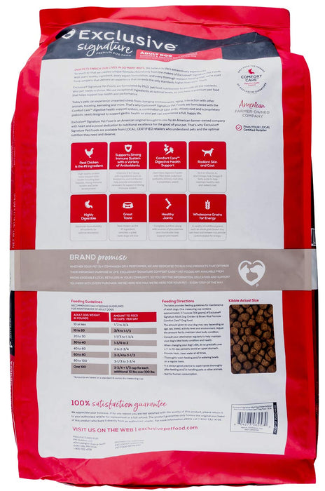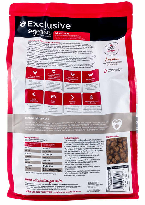 Exclusive® Signature Adult Dog Chicken & Brown Rice Formula Dog Food is formulated to meet the nutritional levels established by the AAFCO Dog Food Nutrient Profiles for maintenance of adult dogs.
