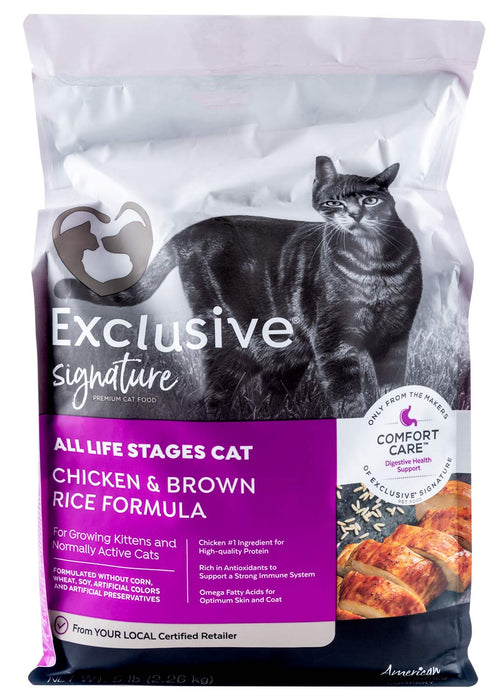 Exclusive Signature Chicken & Brown Rice Formula Cat Food is formulated to meet the nutritional levels established by the AAFCO Cat Food Nutrient Profiles for all life stages of cats.