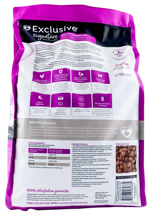 Exclusive Signature Chicken & Brown Rice Formula Cat Food is a high-quality dry cat food made with real chicken as the first ingredient. Formulated for all life stages—including growing kittens, active adults, and seniors—it supports overall wellness with ingredients that promote healthy digestion, immune strength, and a soft, shiny coat. This recipe includes Comfort Care® Digestive Health Support and contains no corn, soy, wheat, or artificial colors, flavors, or preservatives.
