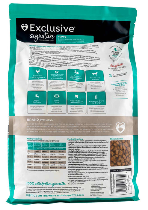 Exclusive Signature Chicken & Brown Rice Puppy Food is formulated to support healthy growth and digestive health in small and medium breed puppies up to 1 year old. With real chicken as the first ingredient and no corn, wheat, soy, or artificial additives, it's ideal for puppies with sensitive digestion. With Comfort Care™ Digestive Health Support, prebiotics, and probiotics, this recipe helps nurture a strong immune system, healthy skin and coat, and proper development.