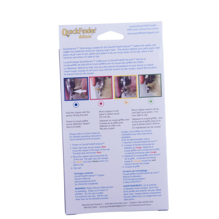 The QuickFinder Pet Nail Clipper makes trimming your pet’s nails safer and easier with innovative QuickSensor electronic technology. The built-in lighted system gives clear visual cues—red, yellow, and green—to indicate when it's safe to clip, helping prevent accidental injury. Each clipper comes equipped with 2 "AAA" batteries for immediate use.