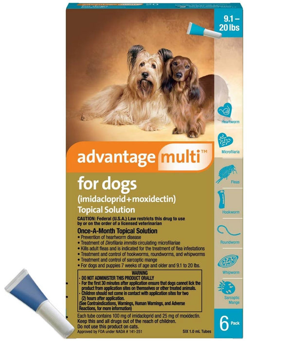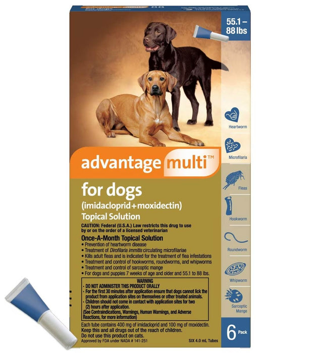 Advantage Multi for Dogs is a convenient, broad-spectrum heartworm preventive in a monthly topical application. It is also indicated to kill adult fleas and treat flea infestations, as well as treat and control roundworm infections caused by Toxocara canis and Toxascaris leonina, hookworm infections caused by Ancylostoma caninum and Uncinaria stenocephala, and whipworm infections caused by Trichuris vulpis. Advantage Multi for Dogs is for use on dogs and puppies at least 7 weeks of age and weighing at least 3 lbs.