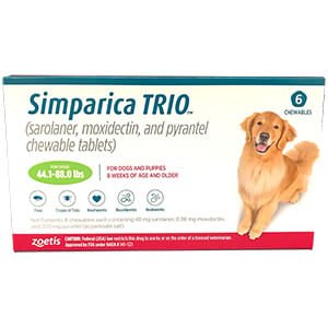 Simparica Trio is a monthly chewable treatment for dogs that provides triple protection against heartworms, ticks, fleas, roundworms, and hookworms. Starting to kill fleas in just four hours, it is also safe for puppies from eight weeks of age, offering complete protection in one convenient dose.